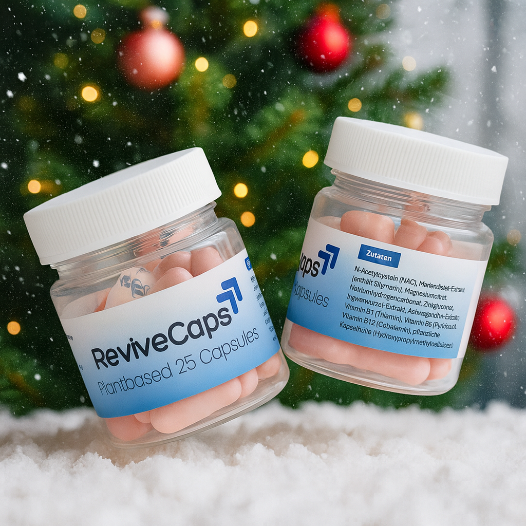 Revive Caps versorgen deinen Körper mit Elektrolyten, Vitaminen und pflanzlichen Extrakten, die den Flüssigkeitshaushalt stabilisieren und die Regeneration nach Alkoholkonsum unterstützen.